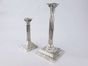 ANGLETERRE, début du XXe siècle : 2 bougeoirs en argent fourré à colonne corinthienne cannelée, les bases carrées, l’une à perles par WALKER & HALL 1924 et l’autre plus haute à godrons tors par HAWKSWORTH EYRE & CO Ldt 1905 (chiffré sur une doucine à la base EJA - EVA 1881-13 oct. -1906).Poids brut : 3156.7 g. Petites soudures aux bases fourrées. H. 33.3 et 23.8 cm. + 2 Housses.