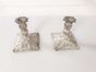 CHRISTOFLE, production moderne, réédition d’un ancien modèle : paire de bougeoirs de toilette en métal argenté, modèle à feuillages, volutes et godrons, la base carrée et le fût tubulaire. Signés. Nouveau poinçon de responsabilité d’après 1983. H. 12.3 cm. un tour de binet avec petite déformation sur une feuille. Bel état.
