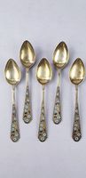 RUSSIE SOVIETIQUE, XXe siècle, années 1960 : suite de 5 cuillers à thé en vermeil 875 mil., la spatule à décor interne émaillé d’une guirlande de fleurettes, le dos lisse. Poinçons soviétiques de l’étoile à 5 branches d’après 1958. Cygne. Poids : 110.4 g.