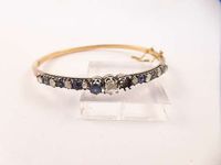 Bracelet jonc ouvrant en or rose 750 mil et argent 800 mil orné d'une ligne de roses et de saphirs ronds (usures, manque pierre, chocs et manques de matière, fêle à la monture). Travail français. (Diamètre :6 cm). 7,9 g.
