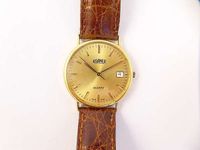 Bracelet-montre d'homme ROAMER en or 750 mil, boîtier rond, cadran doré, index bâton apliqués, guichet dateur à 3H, mouvement quartz, bracelet en cuir brun usé, boucle ardillon en métal. (Diamètre : 33 mm). 29 g. brut