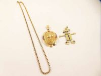 Collier à maillons vénitiens et Pendentif en or 750 mil (perles de culture, pierres imitation). Pendentif pantin articulé en or 585 mil (saphirs, émeraude, pierres imitation). 24,3 g.