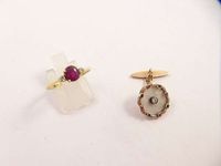 Bague en or 375 mil (rubis, diamants brillantés) (TDD : 55,5). Bouton de manchette en or 375 mil (nacre, diamant TA, rubis, saphirs). 5,1 g.
