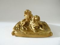 D'après Prosper LECOURTIER (1851-1924) "Deux Cavaliers King Charles assis sur un coussin" Bronze à patine dorée, non signé. Dimensions : 10 x 17 x 12,5 cm.