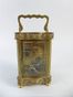 Pendulette d'officier, de forme mouvementée, en laiton doré à décor d'une frise feuillagée, glaces biseautées, double cadran émaillé crème à chiffres arabes. (Avec une clef). Dim. : 12 x 7,5 7 cm. (Email accidenté, éclat à une glace).