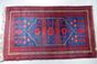 Tapis d'Orient en laine à motifs géométriques, sur fond à dominante bleue et rouge. Dimensions : 183 x 106 cm.