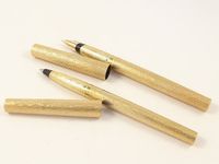 2 stylos en métal doré guilloché PARKER dont 1 roller et 1 plume (plume or 585 mil exemptée, ART 524 du CGI al c). 48,5 g brut.