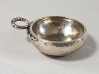 DEPARTEMENT, 1819-1838 : tasse à cidre en argent 800 mil. uni, anse à deux tètes de serpents affrontés. Gravé sous le bord du patronyme G. BOUSCAVET. Poinçons 2e titre et crabe. Orfèvre SPM à l’hermine. Poids : 138.7 g. Diam. 9 cm. Légères déformations.