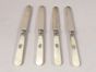 JEAN-BAPTISTE CAMUS, PARIS, FIN EPOQUE RESTAURATION : suite de 4 couteaux à fruits en nacre gravée de palmettes, les lames argent 950 mil., les viroles à godrons tors et les écussons (chiffrés LB postérieurement) sont dispensés de marque. Poinçons Vieillard 1er titre et garantie, orfèvre JBC (actif 1822-1833). Rayures. Poids brut : 144.4 g.