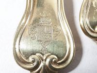 Lot de couverts en vermeil du XIXe siècle : - 1 grand couvert filet par la maison JUGE. Minerve 1er titre. Non chiffré. SECOND EMPIRE. - 1 couvert à dessert filet violoné par THOMAS & HENIN (actif 1861-1865). Minerve 1er titre. Armoiries de Baron militaire d’Empire.- 1 cuiller à dessert LOUIS-PHILIPPE à décor coquille néo-renaissance, le dos lisse. VIEILLARD 2e titre 800 mil. Paris 1819-1838 (38 g).Poids total : 292.8 g dont 254.8 au 1er titre.