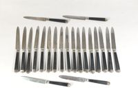 TETARD FRERES, PARIS, VERS 1930 : suite de 21 couteaux à fromage à manches en ébène mouluré, les viroles et culots en argent 950 mil. mouluré dispensés de marque, les lames inox signées. Poids brut : 606.5 g. Fentes