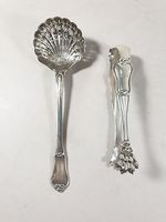 THOMAS & HENIN, SECOND EMPIRE : pince à sucre pieds griffe patte de lion et cuiller à sucre en argent 950 mil. à nœuds gordiens. Chiffrées. Minerve 1er titre et orfèvre actif 1861-1865. Poids : 134.2 g. L. 21.1 et H. 15.5 cm.