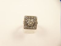 Bague en or gris 750 mil à chaton carré centré d'un diamant TA de 0,90 carat environ dans un entourage de diamants TA (TDD : 53). (Eclat). 8,7 g.