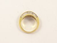 Bague en or 750 mil centrée de 2 lignes de diamants baguettes (TDD : 51,5). (Une pierre égrisée). 7,5 g.