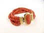 Bracelet composé de 4 rangs de boules de corail facettées, le fermoir en or 750 mil ciselé centré d'un camée en corail figurant un buste de femme à l'Antique. Chaînette de sécurité en or 750 mil. Travail français du XIXème siècle, vers 1840-1860. (Longueur : 17,5 cm environ). 33,6 g. brut