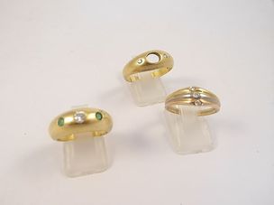 Deux chaînes en or gris et or jaune 750 mil retenant chacun un pendentif orné d'un diamant en serti clos. (Longueur : 37 cm et 41 cm). + Bague en or gris 750 mil centrée d'un grenat dans un entourage de diamants. (TDD : 57). (Egrisures). 8 g.