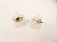 2 Bagues dont un solitaire en or gris 750 mil (diamants brillantés) (TDD : 53,5) et une en or 750 mil (saphir taille poire, diamants 8/8) (TDD : 46). 3,9 g.