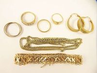 Lot 3 ors 750 mil : 4 bagues (diamants 8/8) (déformations), bracelet (longueur : 19 cm), paire de créoles (chocs), collier (longueur : 45  cm) (déformations). 41,5 g.