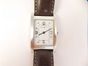 Montre-bracelet d'homme BAUME & MERCIER "Hampton" en acier, boîtier rectangulaire, cadran blanc, index point et chiffes arabes appliqués, mouvement à quartz, bracelet en cuir marron, boucle ardillon en acier, signée et numérotée. (Dimensions : 30 x 24mm).