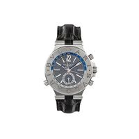 BULGARI GMT, Diagono. Montre d'homme ronde (diamètre : 40 mm) en acier. Lunette gravée BULGARI. Fond vissé. Cadran gris foncé, index en applique, demi-lune bleue de 18h à 6h. Datographe par sous cadran à 6h. Mouvement mécanique à remontage automatique, trotteuse centrale, aiguille GMT. Bracelet cuir noir. Fermoir double dépliant en acier signé Bulgari. Référence : DG 40 S GMT. N° L0798. Sans écrin ni papiers.