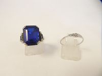 Bague en or gris 750 mil. et platine 950 mil. centrée d'une pierre bleue imitation taille émeraude, épaulée de roses et saphirs suiffés (TDD : 52). (Pierres cassées, égrisures, traces de soudures). Bague en or gris 375 mil. à motif de plume (TDD : 54). 6,5 g