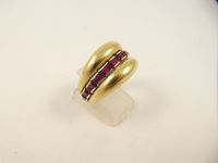 Bague transformable en or 750 mil, anneau central amovible serti de pierres rouges calibréées (TDD : 55). (Légères déformations, égrisures, choc). 10,2 g.