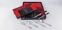 ARGENTAL, Années 1930 : 12 couverts à entremets en métal argenté, modèle navette à filets rubanés. Légères rayures. + Service de couteaux fin XIXe siècle dans son coffret compartimenté comprenant 12 grands couteaux, 12 couteaux à fromages et 1 service à découper 2 pièces. Les manches en ébène à culots coupés et les viroles en métal argenté perlé. Les lames en acier signé Médaille d’or au trèfle. Quelques fentes. Rayures, usures des lames, Oxydations, vert de gris.