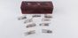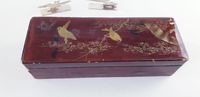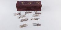 D’APRES BENJAMIN RABIER (1869-1939), Années 1930 : suite de 9 porte-couteaux en métal argenté figurant des animaux des fables de la Fontaine et des aventures de Gédéon le canard (lièvre, cygne, coq, canard, chèvre, éléphant, pélican…). Poinçon de Maître de la maison Pierre DEVOUGE. L. des socles : 8 cm. Rayures et usures. Boite à gant de rangement. en bois vernis. Travail oriental moderne. Sans clé. Eclats.
