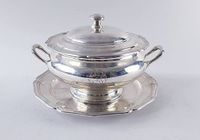 Espagne, XXe siècle : Soupière en argent sur son présentoir en argent, modèle à moulures de filet s et six contour. Monogramme RG sur le plat et le corps de la soupière. Le couvercle à doucine et prise toupie. Poinçons espagnols et Cygne. Poids : 2228.7 g. Diam. 31.8 cm. H. 20.5 cm.
