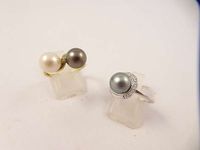 Deux bagues en or et or rhodié 750 mil serties de perles de culture blanche et grises rehaussées de diamants. (TDD : 56 et 51,5). 6,9 g.