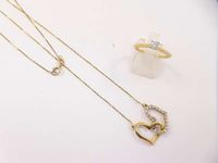 Lot deux ors 750 mil : Collier "coeurs" (pierres imitation) (longueur : 51 cms), bague solitaire ornée d'un diamant brillanté de 0,20 carat environ (TDD : 53,5). 5,2 g.