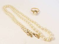 Bague en or 750 mil centrée d'une perle de culture. (TDD : 55). Collier d'un rang de perles de culture blanches en chute, fermoir et chaînette de sécurité en or 750 mil. (Longueur : 49 cm environ ; Diamètre des perles : de 3 à 7mm environ). 15,7 g. brut