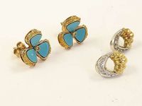 2 paires de boucles d'oreilles en or 750 mil dont 1 figurant un trèfle centré d'un diamant 8/8 et de pétales de pierres décoratives bleues, l'autre godronnée rehaussée de diamants 8/8. 10,8 g brut.
