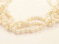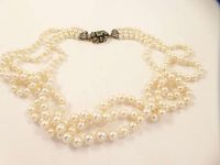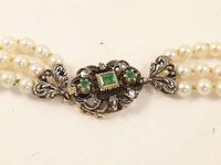 Collier de 3 rangs de perles de culture en chute, fermoir en or 750 mil et argent 800 mil rehaussé d'émeraudes et de roes. 86,1 g. brut