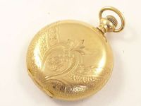 Montre de gousset , savonnette en or 585 mil, cadran blanc à chiffres romains et petite seconde, dos guilloché d'un décor floral, ELGIN, mouvement mécanique. 119,5 g. brut