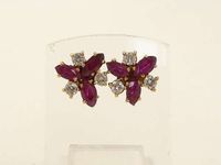 Paire de boucles d'oreilles en or 750 mil composées de 3 rubis taille navette intercalés de diamants brillantés. 3,7 g.
