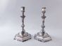 PIERRE LE GOFF, MORLAIX 1758-1762 : paire de flambeaux en argent 950 mil. posant sur un pied hexagonal à contours, doucines et gorges, l’ombilic à ceinture médiane filetée surmonté du fût tronconique à pans, moulures de filets et bagues contour, le binet également hexagonal à pans et contour. Armoiries d’alliance timbrées d’une couronne à 7 perles. Poinçons : Charge et décharge Morlaix 1758-1762, orfèvre Pierre Le Goff reçu en 1754.Poids : 1186.4 g. H. 24 cm. Diam. 15 cm. Exemptés art. 524 bis al.a du CGI.Légères déformations sur un fût penché avec restauration et fente à la base du fût.