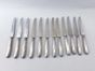 RAVINET D’ENFERT, XXe siècle, première moitié : suite de 12 grands couteaux en métal argenté, modèle perles à moulures de filet fort. Lames inox. Rayures d’usage. TBE des lames.