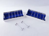 S.F.A.M. XXe siècle : suite de 12 porte-couteaux boules en métal argenté. 2 boîtes de rangement. L. 8.7 cm.