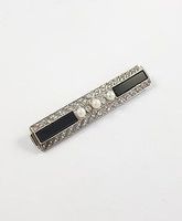 Broche barrette en or 750 mil sertie de diamants TA, de roses et de plaques d'onyx, centrée de 3 perles de culture. (Longueur : 6,5 cm environ. (Système déformé, légères déformations à l'épingle). 10,1 g.
