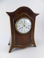 Pendule en placage d’acajou à corniche à décor de filets de bois clair et ornementation de laiton doré. Le cadran en émail, heures en chiffres romans, les minutes en chiffres arabes, signé Planchon Paris. Elle repose sur quatre pieds cambrés. Mouvement signé Planchon, numéroté 663. Style Louis XV, fin XIX ème siècle. Dimensions : 38 x 28 x 16,5 cm. (Avec clés et balancier) (Manques, sauts au placage, fentes)