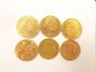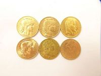 6 pièces de 20 FRF en or 900 mil (usures). 38,7 g.