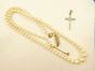Pendentif croix en platine 850 mil serti de diamants 8/8 (Haut. : 3 cm) (éclat). 1,5 g. + collier d'un rang en chute de perles de culture, fermoir en or 750 mil (Long. : 48 cm) (à renfiler) 16,2 g.
