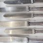 CHRISTOFLE, FILETS RUBANS, XXe siècle : Ménagère de 61 pièces en métal argenté modèle piriforme à filets rubanés et agrafes d'acanthes comprenant 12 grands couverts, 13 grands couteaux, 12 petits couteaux, 11 cuillers à café et 1 louche. Pièces et lames inox signées Alfénide. Poinçon Christofle période 1935-1983 et poinçon de fabricant Alfénide. Rayures d’usage. BE. Non chiffrées. Ecrin Christofle accidenté.Les pièces sont une production ancienne Christofle-Alfénide.