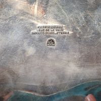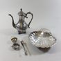 Eugène CASTEL (actif 1903-1910) : passe-thé panier en argent 950 mil uni à frise de vagues rocailles et à décor repercé d’une rosace. Minerve 1er titre et Poinçon de Maître. Bosselé. Poids : 14,3 g. Diam. 5 cm. On y joint un lot en métal argenté, fin XIXe-début XXe siècle : - Passe-thé panier polylobé en métal argenté à fond repercé de fleurettes. Légères déformations. - Pince à sucre ROUX-MARQUIAND de style XVIIe, les pinces en forme de cuillerons. L. 13.4 cm. - Cafetière balustre quadripode à cartouches et feuillages. Marquée « JA » et « AB » et numérotée sous la base « 1893 ». H. 25 cm. Petits chocs et usures d’usage. + de la maison MAPPIN & WEBB, 1 rue de la PAIX, à PARIS, XXe siècle : 1 Coupe de forme coquille en métal argenté à trois pieds boule, doublure en verre à la forme. Signée et poinçon de Maître. Dim. 5.5 x 27.2 x 24 cm. Petits éclats au verre.
