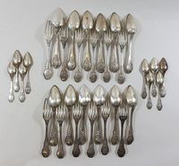GUILLAUME DENIERE, actif 1850-1855 : suite de 12 grandes fourchettes, 12 grandes cuillers et 9 cuillers à café en argent 950 mil. modèle violoné à filet et lambrequins, les cuillerons pointus. Monogrammés PCP (en lettres gothiques sur les grands couverts, lettres anglaises sur les petites). Minerve 1er titre et grand poinçon de Maître. Poids : 2151.2 g. L. 21.6 cm à 14.8 cm. Rayures et usures d’usage.