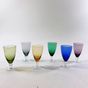MAASTRICHT, HOLLANDE, Modèle CARNAVAL, Designer MAX L.H.M. VERBOEKET, Vintage années 1950 : Suite de 6 petits verres à bière en cristal ROEMER de couleurs grise, améthyste, vert émeraude, vert olive, bleu cobalt et ambre. Non signés. H. 11.8 cm. Micro-rayures. TBE. Dans leur boîte d’origine défraîchie.Max L.H.M. VERBOEKET est né en 1922 et devint le nouveau designer de la cristallerie en 1954. Il créa en 1956 la ligne CARNAVAL. Il travailla pour la Maison MAASTRICHT jusqu’en 1972.
