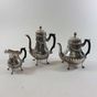 MARTIAL GAUTHIER (actif 1888-1902) : Service à thé-café 3 pièces de la fin du XIXe siècle en argent 950 mil. comprenant 1 théière (H. 18.5 cm), 1 cafetière (H. 21 cm) et 1 pot à lait (H. 10.6 cm). Modèle balustre à quatre pieds sabot, le décor à godrons rayonnants et feuilles d’acanthe sous guirlandes rubanées. Les frétels en grenade éclatée et les anses en ébène. Minerve 1er titre et petit poinçon de Maître GM étoile en 2 croix grecques. Poids brut total : 1203.3 g. Manque la goupille du couvercle bosselé de la cafetière. TBE. Non chiffré.