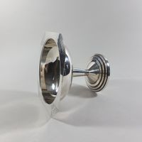 ROUX & MARQUIAND, Années 1930 : Coupe à fruits ou gâteaux en métal argenté, le piètement rond mouluré de gradins circulaires, fût tubulaire fuselé et vasque ronde à pans coupés gravés de motifs géométriques. Poinçon de Maître. H. 18.3 cm. Diam. 23cm.TBE. Non chiffrée