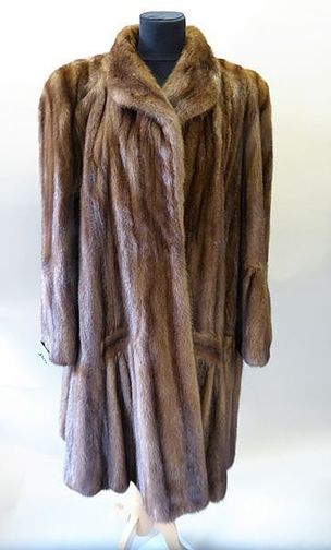 SAM RONE : 7/8ème en pattes de Vison dark à travail chevron, petit col, fermeture par agrafes, deux poches, manches longues. Taille 40-42 environ.